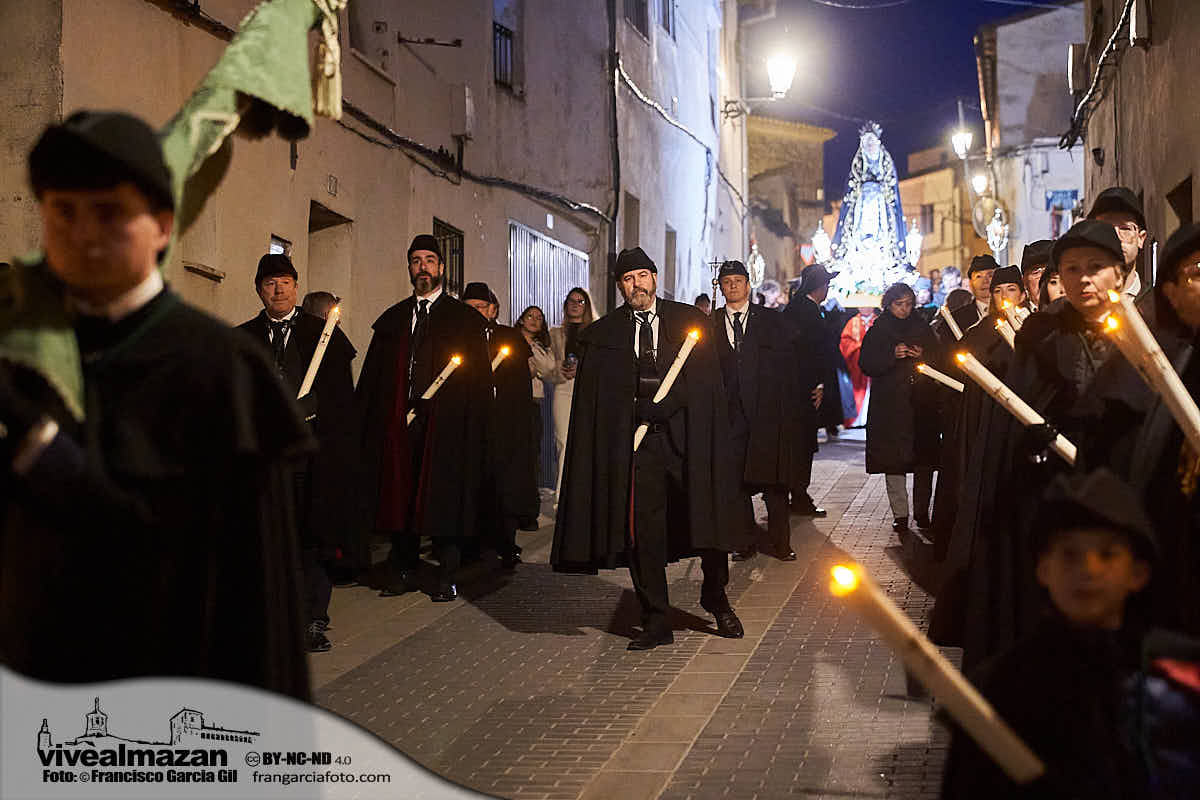 A las 20:00 horas. La Cofradía del Santo Entierro de Almazán se ha congregado en su sede de las Casas Parroquiales al mismo tiempo que lo hace la Cofradía de la Vera Cruz para partir en procesión hasta la Iglesia de Campanario.