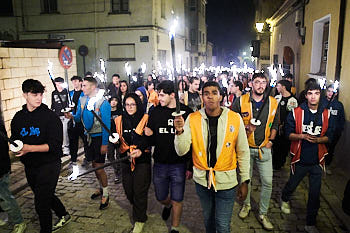 Tras el encendido, comienza el recorrido de costumbre hasta la Plaza Mayor, donde, después de dar alguna vuelta a la misma, las Peñas se reúnen y forman sus hogueras.